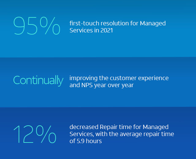 | Streamlined to save you time | As we've adopted the industry-leading SaaS solution, ServiceNow, as our post-sale platform, we’ve consolidated roles, streamlined processes, introduced more automation, improved data quality, and enabled more self-service options—all so you can spend less time managing your solution and more time focused on your business. |