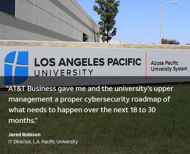 A cybersecurity posture assessment from AT&T Business gave Los Angeles Pacific University an overall view of the school’s security and a cybersecurity roadmap, detailing quick-win recommendations and long-term strategic goals.